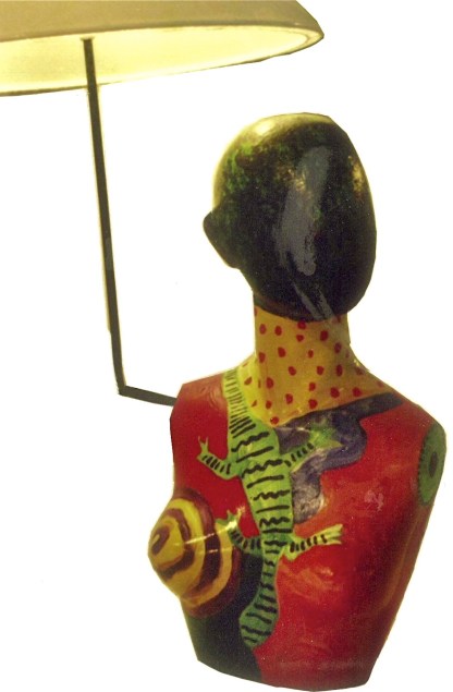 - Choose a curious part of the bust figure to highlight. In my example, I highlighted one breast and had some kind of ‘gator’ crawling in the middle. The head was painted black and sponged with green paint so as not to draw attention away from the chest area.