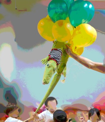 We showed up half an hour before the end of class. After seeing Daddy and Mommy and then Allie, somehow my son knew the event may have something to do with him, hahahaha Below is a photo of the kids in the playgroup enjoying Allie’s company. What a great idea to tie the balloons to Allie and shake him all around. And boy, did the kids enjoy chasing him and pulling his tail. They had lots of laughs -that’s for sure!
