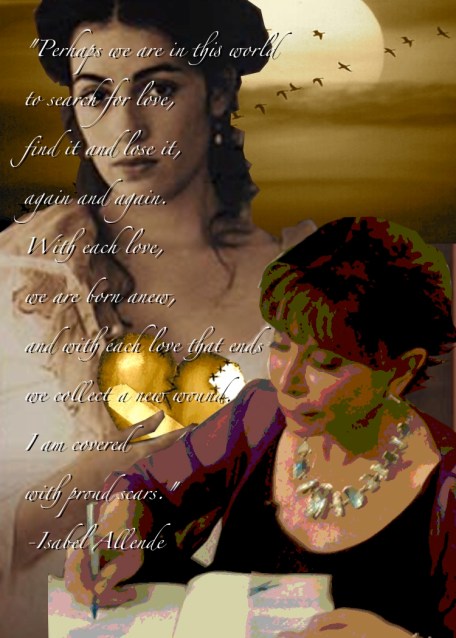 | “Isabel & Her Proud Scars” A Portrait of Isabel Allende a literary artist who uses her life scars as inspiration for her stories a digital collage by Paulina Constancia “Isabel Allende Llona (born in Lima, Peru, on 2 August 1942) is a Chilean writer with American citizenship. Allende, whose works sometimes contain aspects of the “magic realist” tradition, is famous for novels such as The House of the Spirits (La casa de los espíritus, 1982) and City of the Beasts (La ciudad de las bestias, 2002), which have been commercially successful. Allende has been called “the world’s most widely read Spanish-language author”. Allende’s novels are often based upon her personal experience and pay homage to the lives of women, while weaving together elements of myth and realism.” (Wikipedia) —————————-