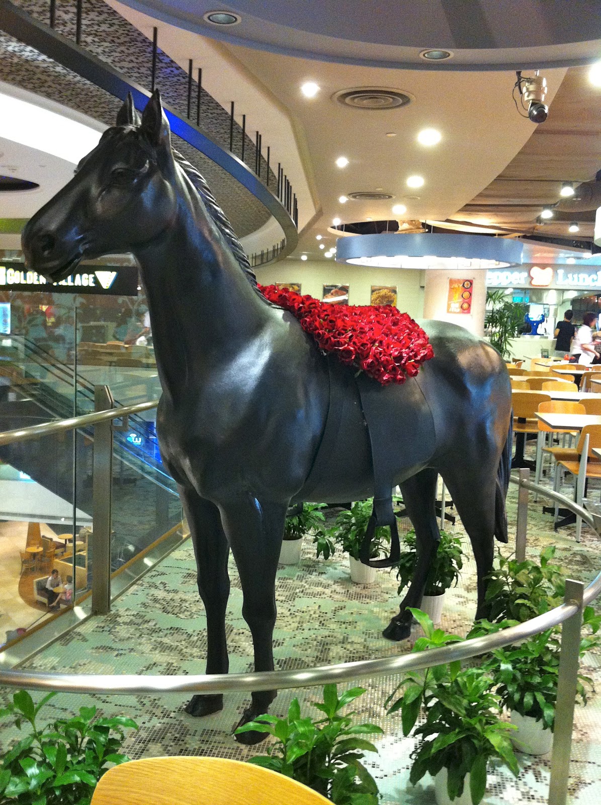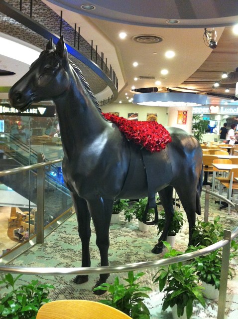 Today I share with you two large horse sculptures that I found in food courts in Singapore. When I first saw them I asked myself why in the world would you have horses in a food court. So I investigated a little bit on the symbolism of these creatures in the predominantly Chinese culture of Singapore.