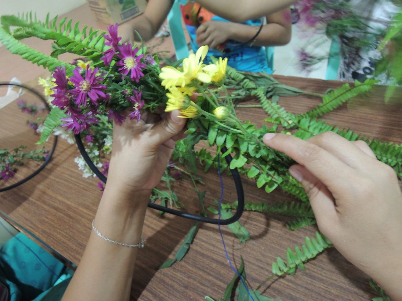 Participants start making their crowns- using the thread to slowly wrap the greens and flowers around the ring.