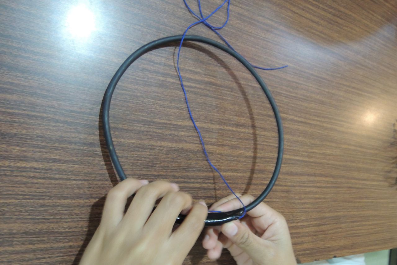 Make the crown base, some people use thin branches. For the demo, we used some recycled wire. Size it to fit your head. Tape up the end. Tie a thread about a meter long to the ring. |