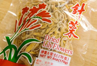 Also known as golden needles and tiger lilies, dried lily buds are the unopened flowers of day lilies. The lily, Hemerocallis to use its scientific name, has been used in China as both a food and medicine for over 2,000 years. Dried lily buds are yellow-gold in color, with a musky or earthy taste. Two dishes featuring lily buds are Muxi Pork, a stir-fried dish, and Hot and Sour Soup