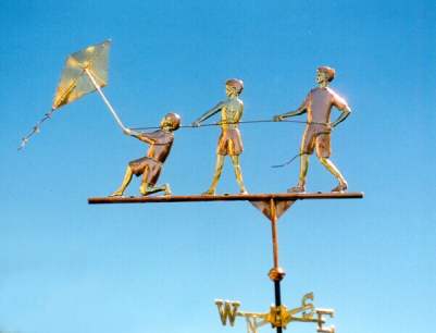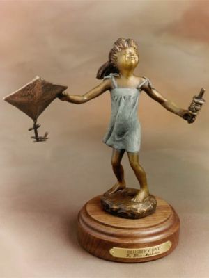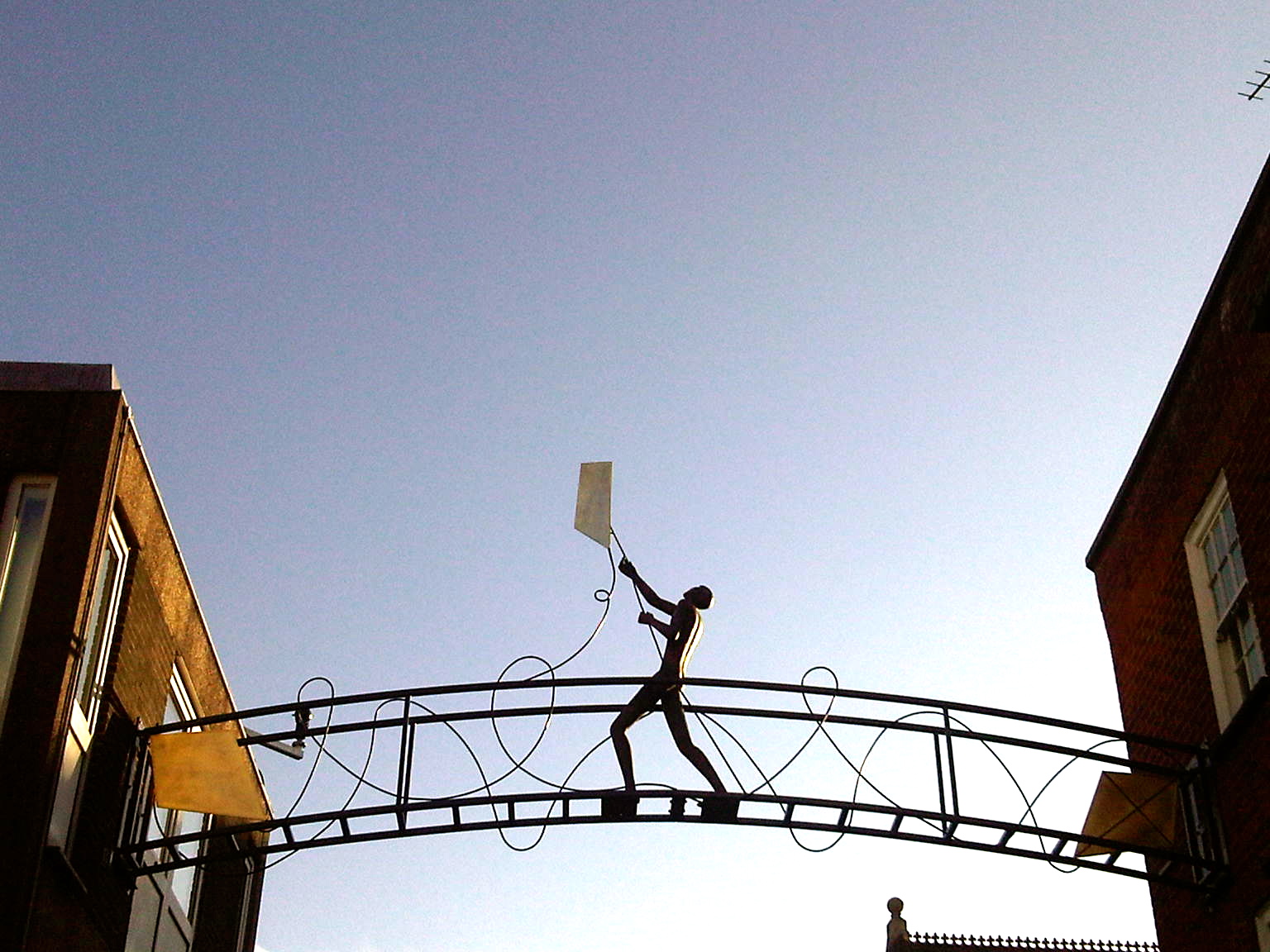 The Kite Flyer is a bronze figure of a young man flying a golden kite on a bridge. The work was commissioned by Winchester City Council and installed in April 2009. The sculpture arcs across Parchment Street at a height of nearly six metres creating a popular new landmark for the city. The street is one of the most significant historical streets in Winchester and clearly visible from the high street.