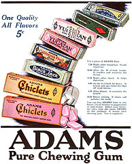 Sitting in his workshop one day,tired and discouraged, he popped a piece of surplus stock into his mouth. Shortly, he opened the world’s first chewing gum factory making Adams New York No. 1.