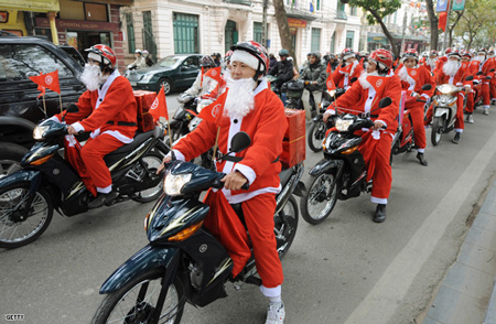 Today’s feature was inspired by our Christmas holiday in Vietnam in 2010. The first thing I noticed when we arrived in Ho Chi Minh City was the incredible number of motorbikes on the road. I mean you don’t even see the road anymore, you just see the motorcycles. It’s that many. And if you want a rough figure, here goes—there are about 5 million motorbikes in Ho Chi Minh alone. And think about this number in proportion to the city’s population of 7 million. And during the Christmas week, almost every kid riding on a motorbike (with his parents, of course) is dressed as Santa. No other place in the world takes the Santa business as seriously as Vietnam.
