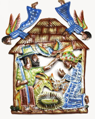 Two Haitian angels bend low over the Haitian Holy Family in this bright Caribbean wall hanging nativity. Artisans make this nativity from painted cut metal.