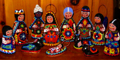 This set of nativity scene figures are were made by a Huichol artist who covered ceramic figures with bees wax, then impressed seed beads into the wax to create the colorful designs