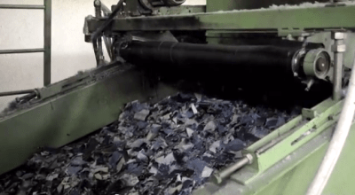 Old worn out jeans are cut into pieces and put together into a new fabric.