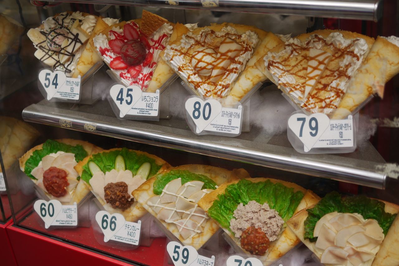 Photo by Michael Wortman Display cases show the different flavor offerings with the crepes spread like a fan. However, your crepe will be served to you rolled like a cone. From the sweet to the savoury, the Harajuku crepe is loaded with yummy goodness!