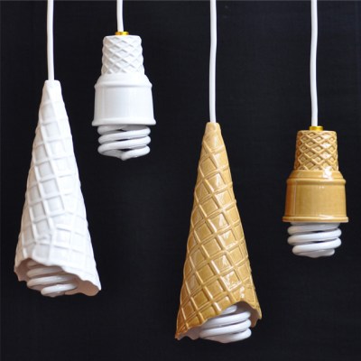 “Cleverly incorporating the twirling design of the compact fluorescent lightbulb, Alex Garnett has designed a series of upside-down hanging earthenware Cone Lamps that were inspired by Mr. Whippy soft-serve ice cream cones.” Text from laughingsquid