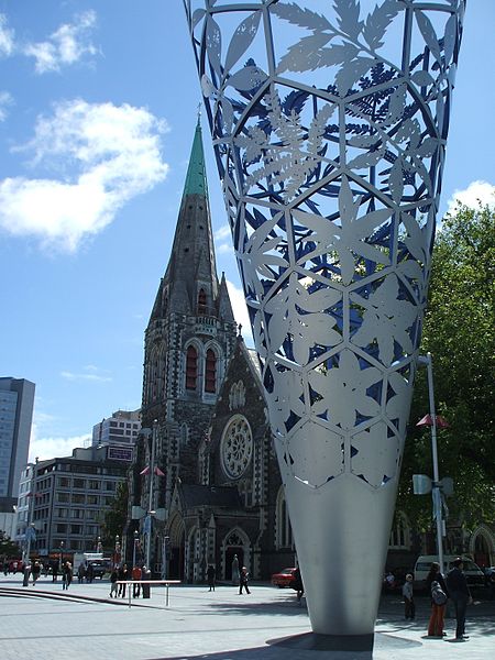 18 metres high, 2 metres in diameter at ground level and 8.5 metres in diameter at the top, its shape mirrors the spire of Christchurch Cathedral.