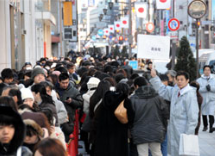 The Ginza shopping district saw a mass of lucky-bag hunters.At 9 a.m. long lines of people on Ginza Dori were braving the chilly morning air to get first crack at the street’s close-packed shops and department stores.