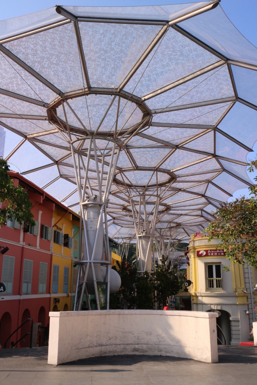 The streetscape has been transformed into a pleasant climate-moderated environment of landscaped arcades. Elegant canopies, providing environmentally friendly shading and cooling, which protect visitors against the extremes of the Singaporean climate and maintain the temperature at 28 degree Celsius, cover the four internal streets and central courtyard.