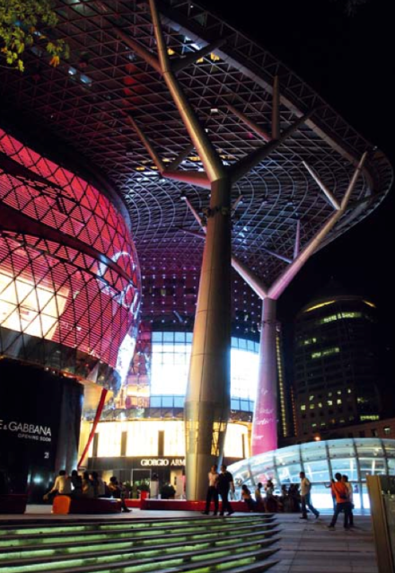 “Breaking new design ground, Benoy has introduced Singapore’s first pure monocoque façade and canopy structure at ION Orchard. Benoy’s design for ION Orchard makes direct reference to the contours and lines of fruit and nuts; the retail canopy draws on the metaphors of ‘skin’ and ‘foliage’ while the iconic tower design is based on the concept of ‘roots and shoots’ growing up out of the canopy below. In collaboration with Arup’s façade engineering team, the canopy continues into the skin, wrapping the whole podium in mild curves, resembling a fruit peel. The powerful organic presence communicated through a uniquely free form feel, amorphous cladding and tree-like columns provoke interaction between visitor and destination.” Read more