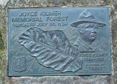 “In 1938, the US federal government purchased 3,800 acres of old growth forest in North Carolina to stop extensive logging. The tract of forest was dedicated to the memory and service of Kilmer. His name has also been given to many streets and schools across the country as well as a park in the Bronx…” from The Poetry Foundation