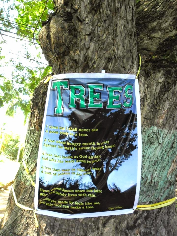 A couple of weeks ago, I did a series called LiTREEture and included the “Trees” poem of Joyce Kilmer. After seeing this photo of Kilmer’s poem tied to one of the Cebu trees in danger of getting axed to make room for a road widening project, I thought I would make a poem inspired by Kilmer’s “Trees”, so here’s what I came up with: