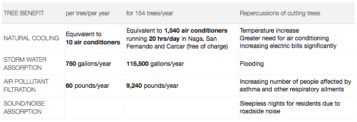 Here is a table I have made to quantify the benefits of the 154 trees that are marked to be axed to pave the way for the Naga-Carcar Road Widening Project: (Note: This is a conservative estimate.)