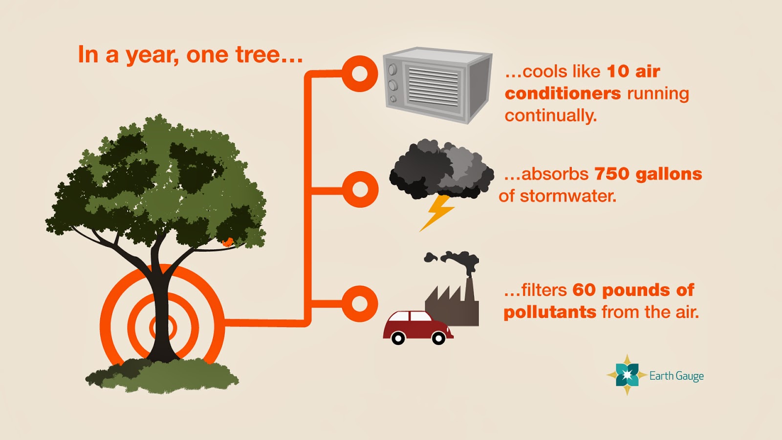 - Trees shade cars and parking lots, reducing ozone emissions from vehicles.