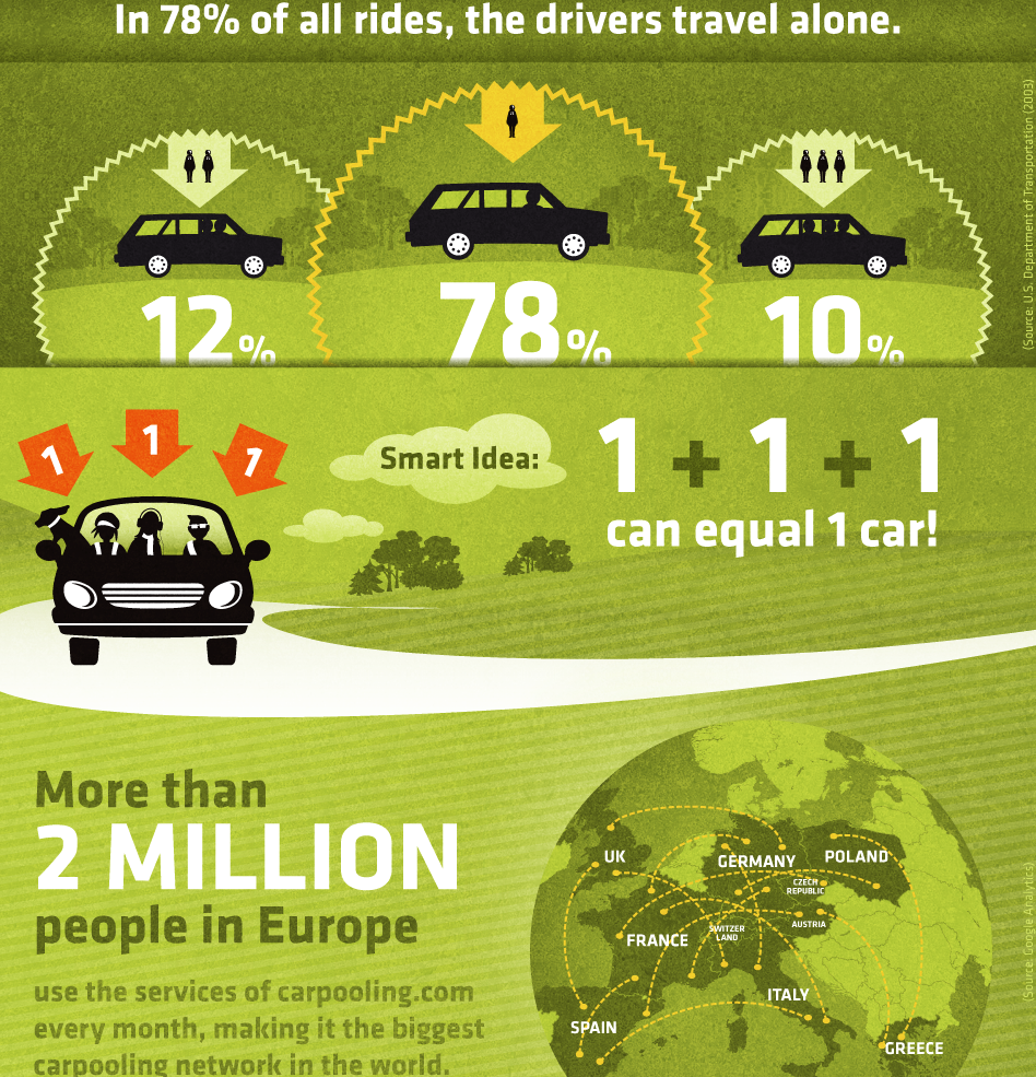 Carpooling.com -is a multimodal platform, which also integrates bus, train and plane offers so people can compare and choose the most convenient way to travel. -wants to make carpooling easy, safe and accessible to all -In just a few seconds, drivers can offer empty seats and passengers can book a ride to their destination. People can check user profiles and choose who they want to ride with, how much space and comfort they need, where they want to meet and what they are willing to pay. -connects people in over 40 countries so they can travel together. Today the site is available in 7 languages: English, French, German, Greek, Italian, Polish and Spanish Check out this pretty impressive data visualization of CARPOOLING in Germany.