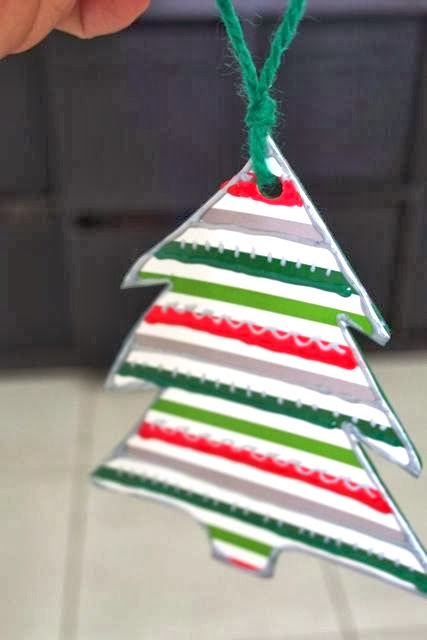 4. Allow to dry completely and then pierce or punch a hole at the very top of tree. Cut a 25 cm green yarn, pull through hole, and tie it to make a loop for hanging.