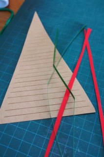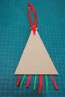 8. Cut a 20 cm red ribbon to serve as a hanging loop, glue to back of triangle. (See picture below)