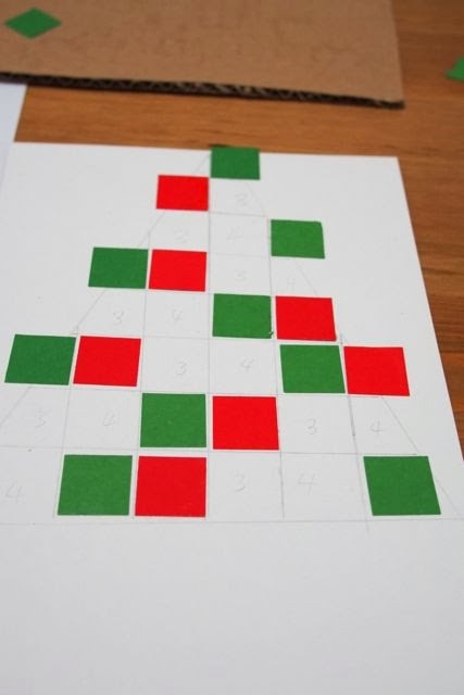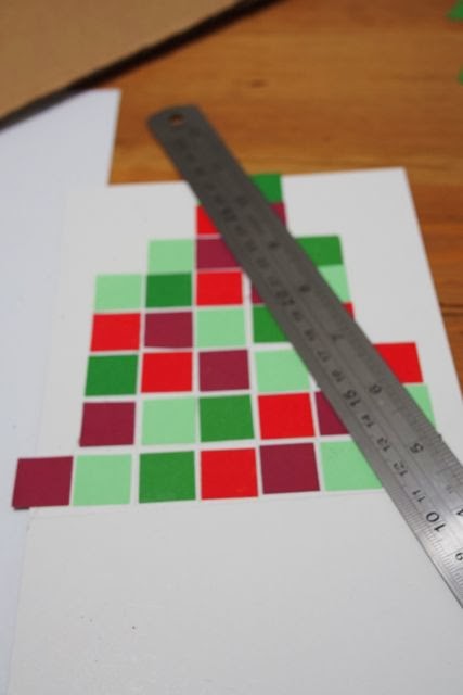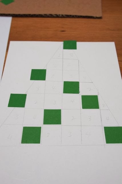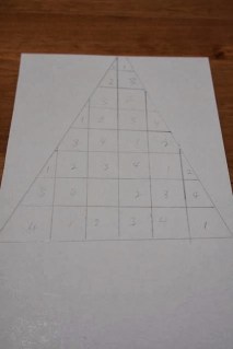 1. Draw tree shape on white cardboard.(My example is for a 20 cm tree – that’s including the 5 cm trunk. However, you can make your tree as big or as small as you want). Divide triangle into squares (big enough to accommodate your punched squares, & still have some space between tiles).