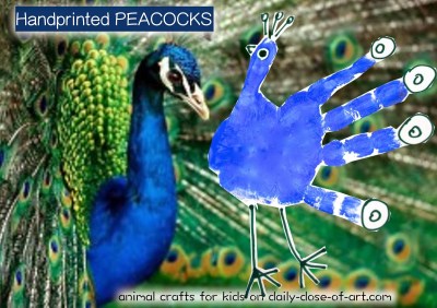 Animal Crafts for Kids #5 “HANDPrinted Peacocks” on daily-dose-of-art.com |