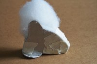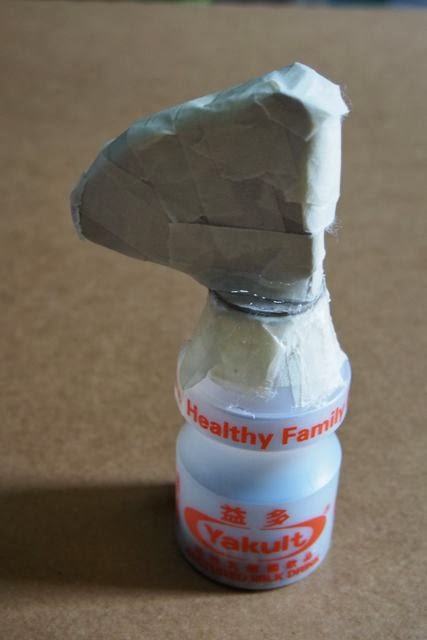 Step 3- Secure fiber fill with masking tape. Using the glue gun, adhere horse head onto Yakult bottle.
