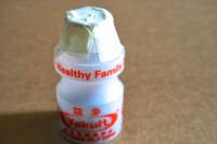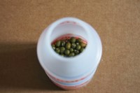 Step 1- The Rattle Base. Fill the Yakult bottle with mung beans (about a quarter full). Cover with cardboard.