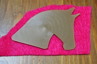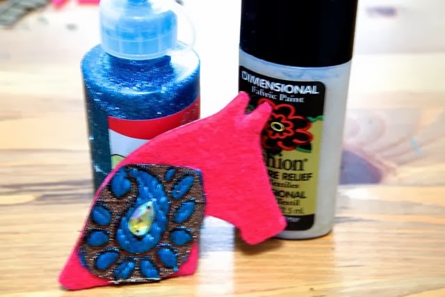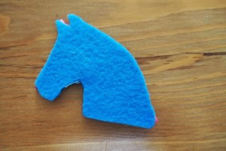 Step 6- Use the horse head silhouette again to cut a felt cover for the back. I used a coordinating blue color. Adhere to back using white crafting glue. For a finished look, use blue glitter glue all around the sides and allow to dry completely.