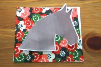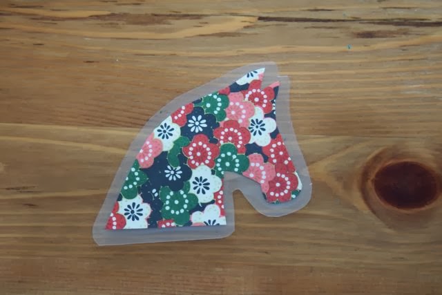 Step 1- Glue origami papers back to back. Cut horse head shape using template.