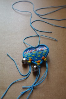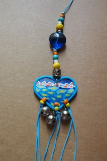 Play around with your main heart piece, bells and assorted beads. Take a photo so you will remember your design and refer to it as you go along.