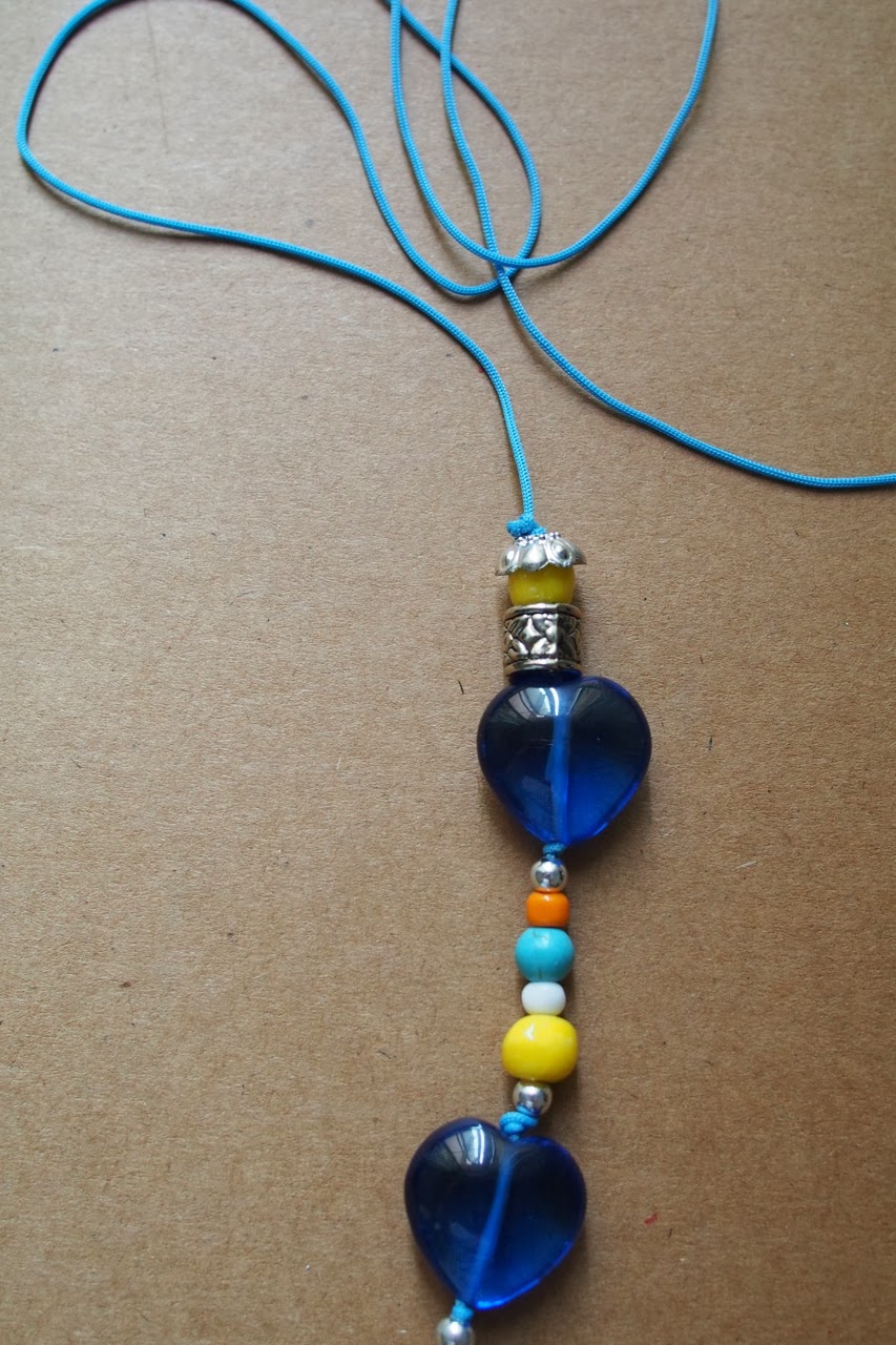 Step 5: Thread beads and knot whenever you have a big bead following a smaller bead (this will ensure they are threaded tightly together. For my design, I knotted before and after the blue hearts.