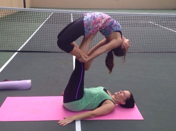 Photo shows Hana at a partner yoga class.