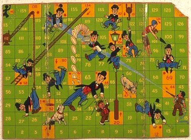 “The game was sold as Snakes and ladders in England before Milton Bradley introduced the basic concept in the United States as Chutes and ladders, an “improved new version of … England’s famous indoor sport.” Its simplicity and the see-sawing nature of the contest make it popular with younger children, but the lack of any skill component in the game makes it less appealing for older players.” via pinceton.edu
