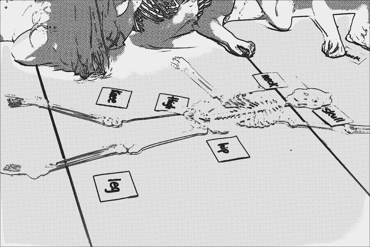 I brought a flat plastic skeleton to help kids visualize the different bones;