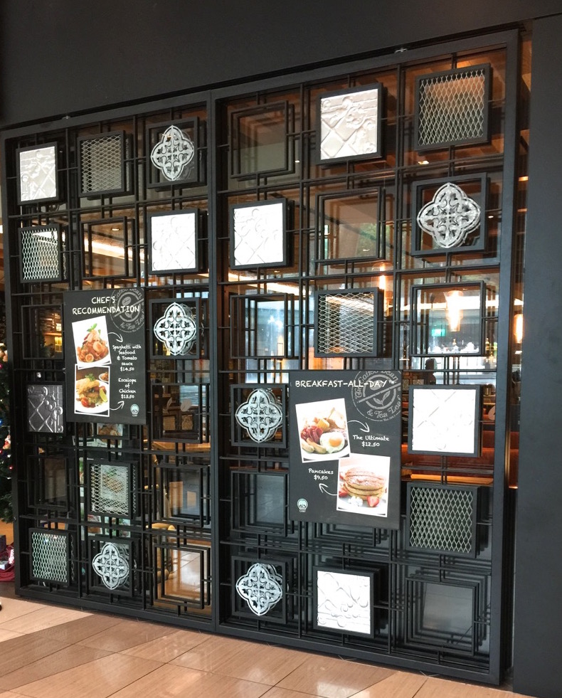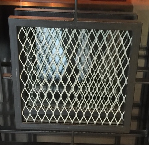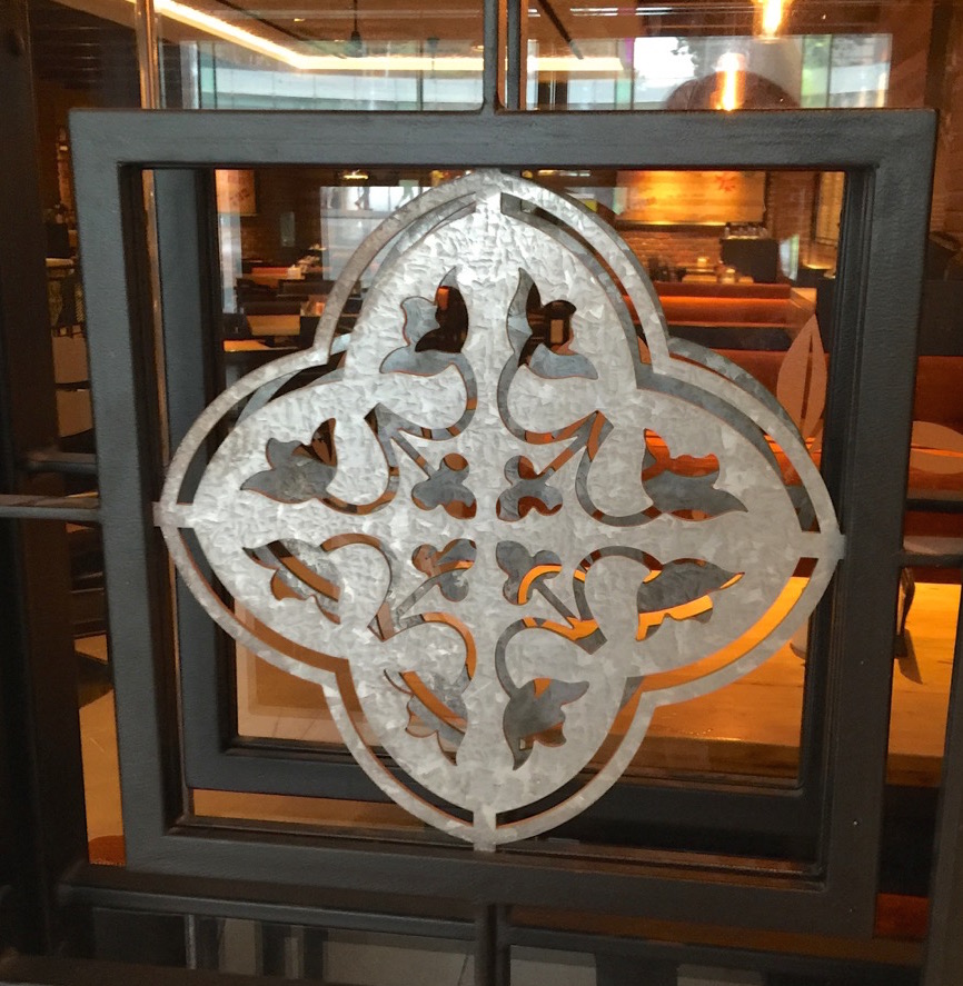 The Idea: A dynamic Multi-Section Iron Grill Divider that creates a little privacy without completely blocking view/light. The basic and unifying element is the square, and various aluminum/steel elements are used to fill that space.
